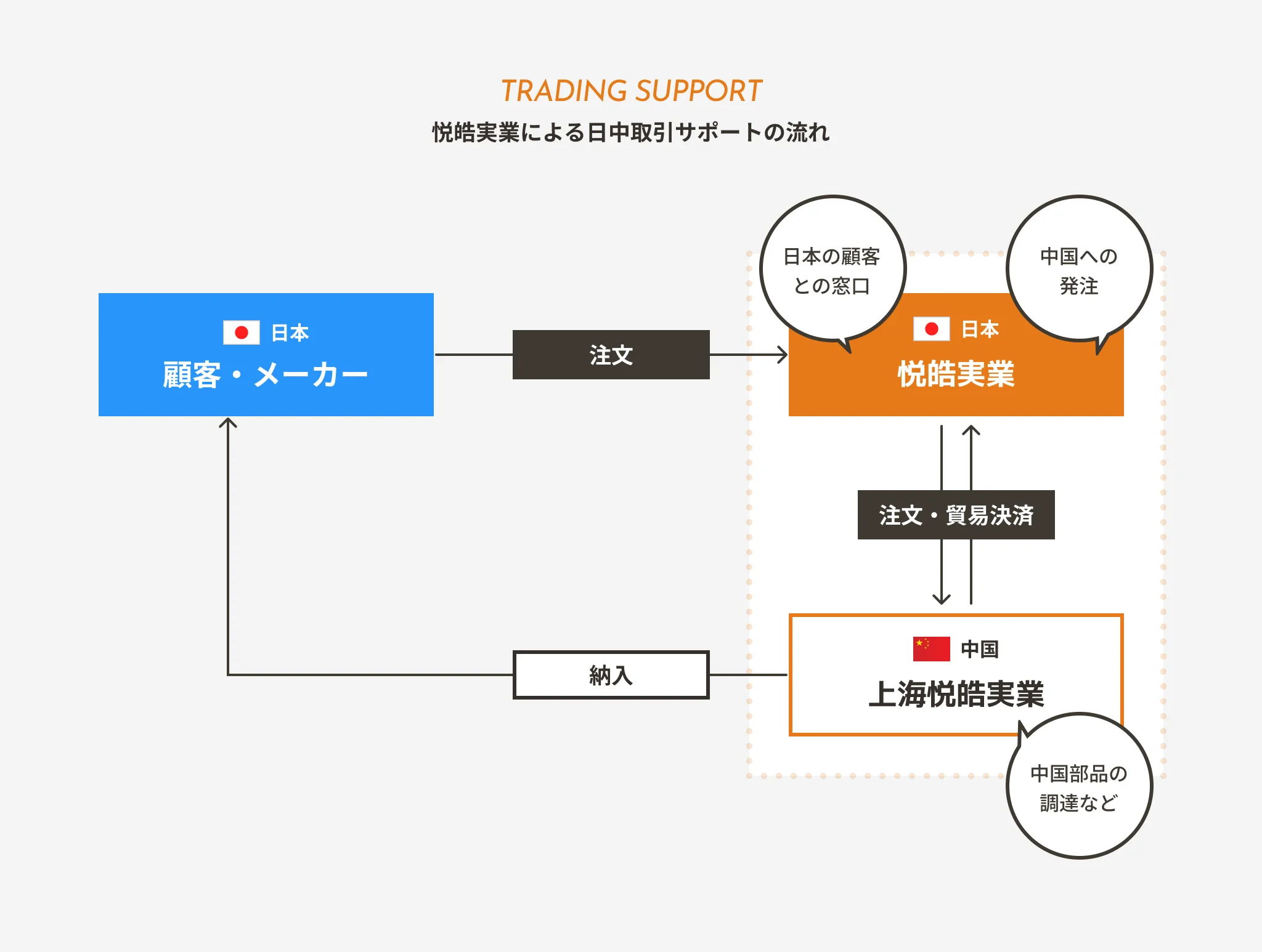 日本企業が中国へ部品を発注する際、悦皓実業が窓口となり、調達から納品まで一貫してサポートします。