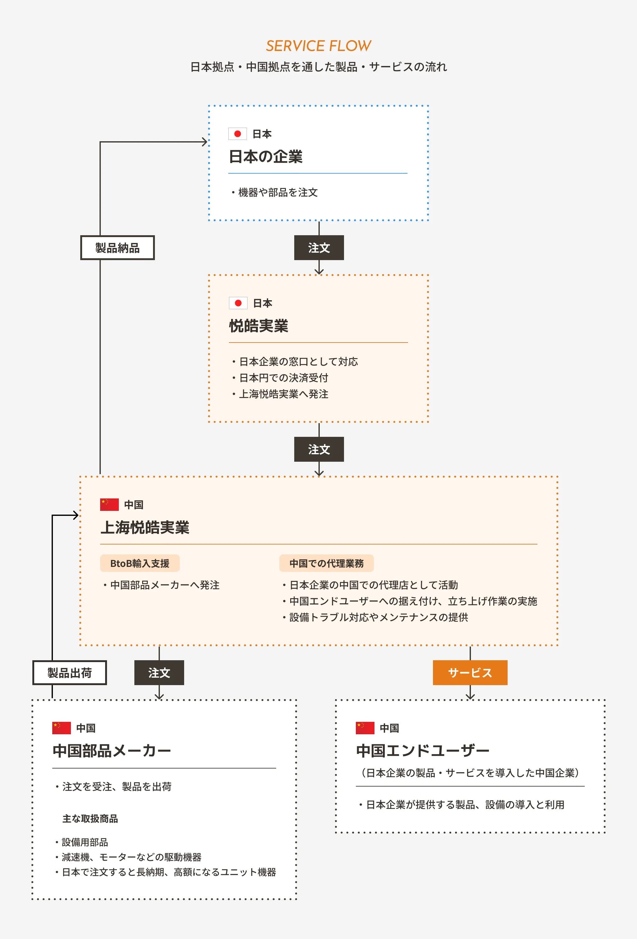 日本企業が中国企業へ機械やサービスを提供する際には、上海悦皓実業が現地にて据付、立ち上げ、